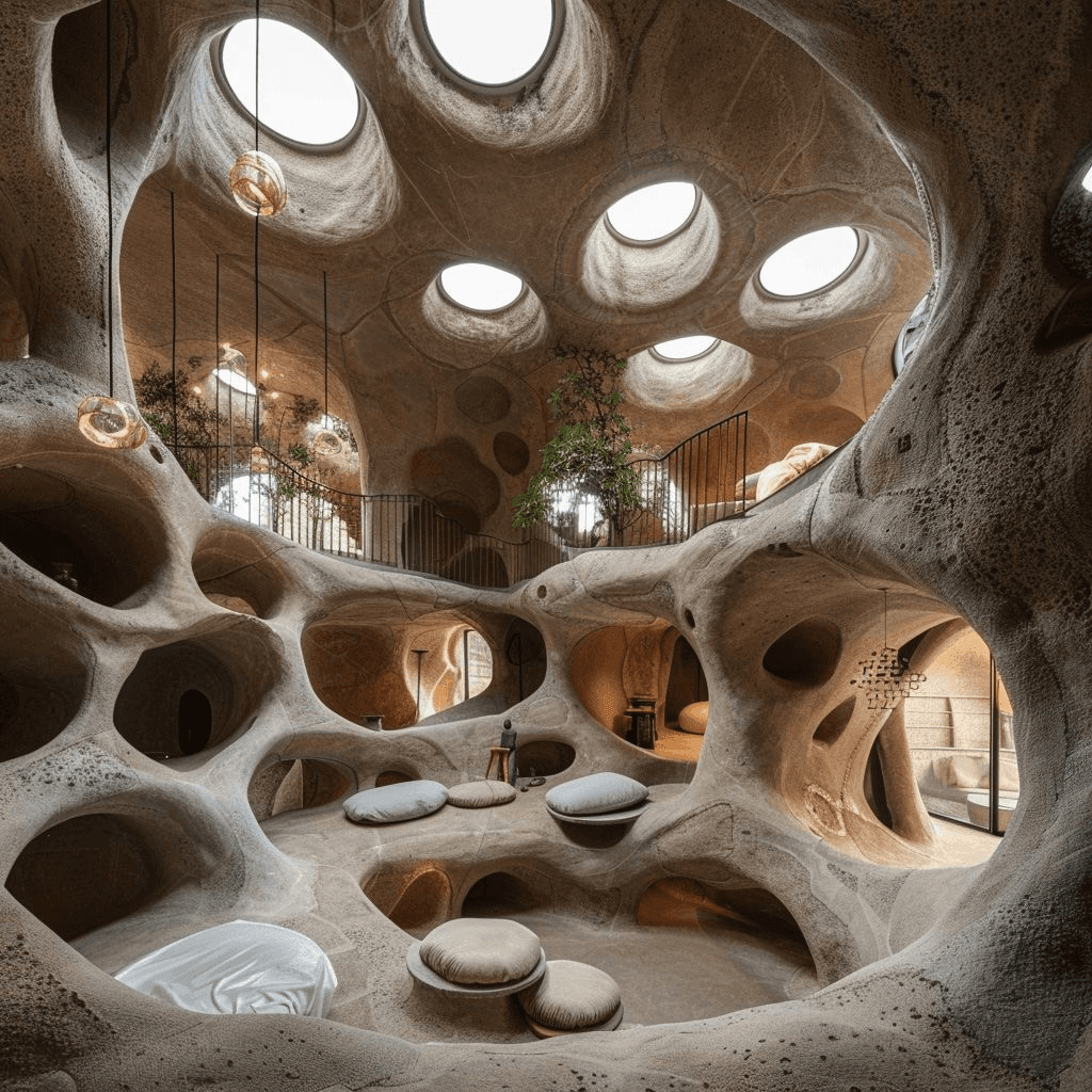 Everything is interactive: he taps to replace a chair, adds a fountain. The space responds like a living canvas.